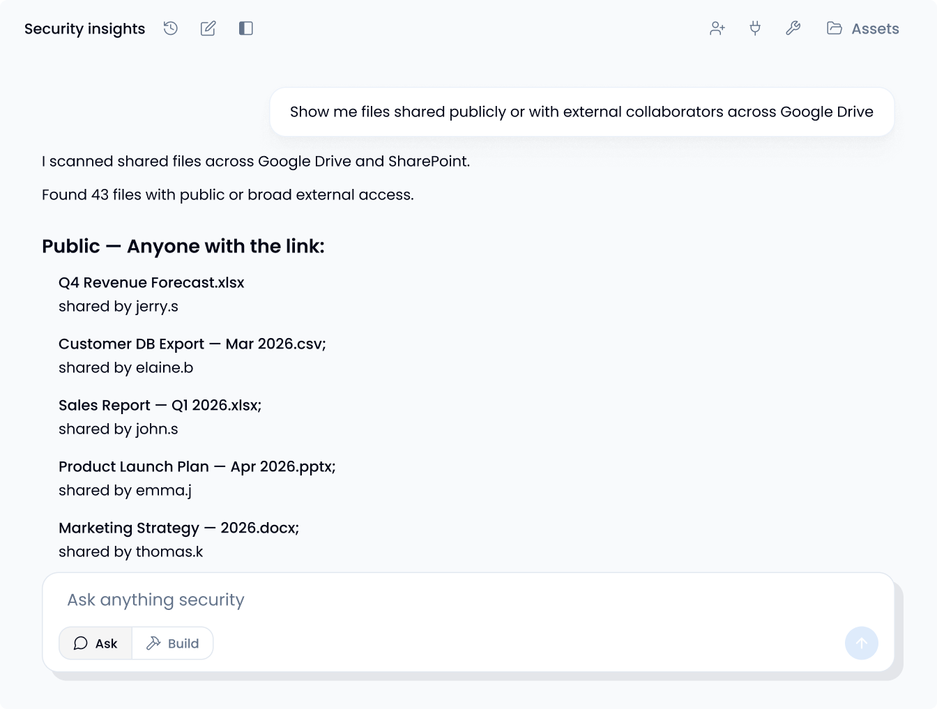 Prompt your SaaS environment in plain language. Try "Which files are shared publicly across all drives?" or "List OAuth apps with export access unused for 60 days." Get structured answers with queries you can inspect, edit, and rerun anytime.