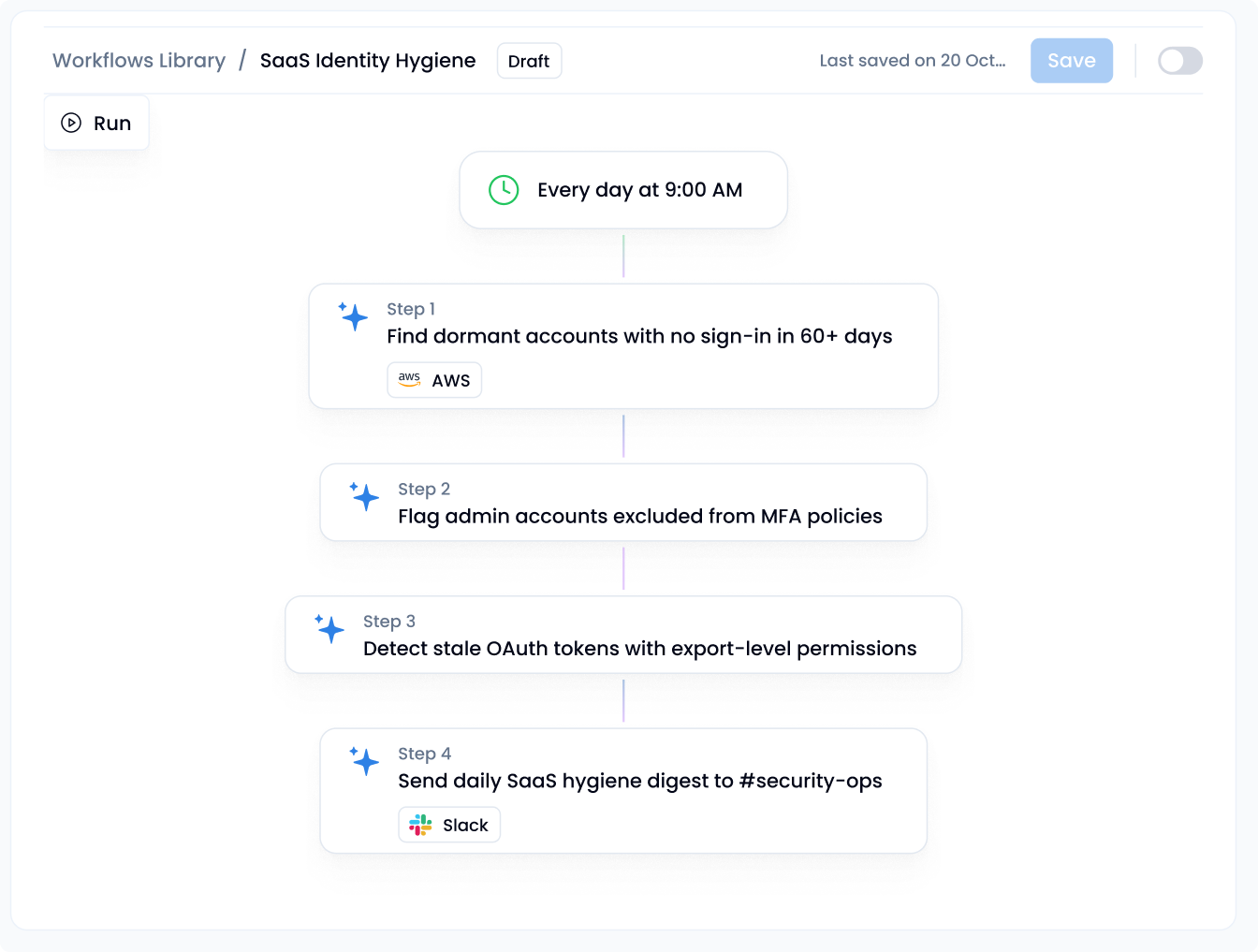 Turn your questions into a reusable app: oversharing reports, admin access reviews, OAuth hygiene dashboards. Add alerts and recurring workflows that keep running on schedule. When the next audit comes around, your evidence is already fresh and ready to export.
